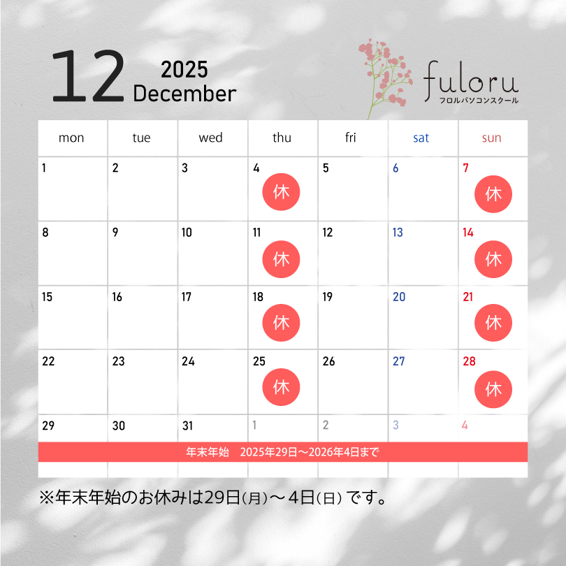 12月のお休みは通常通り木曜日と日曜日がお休みです。